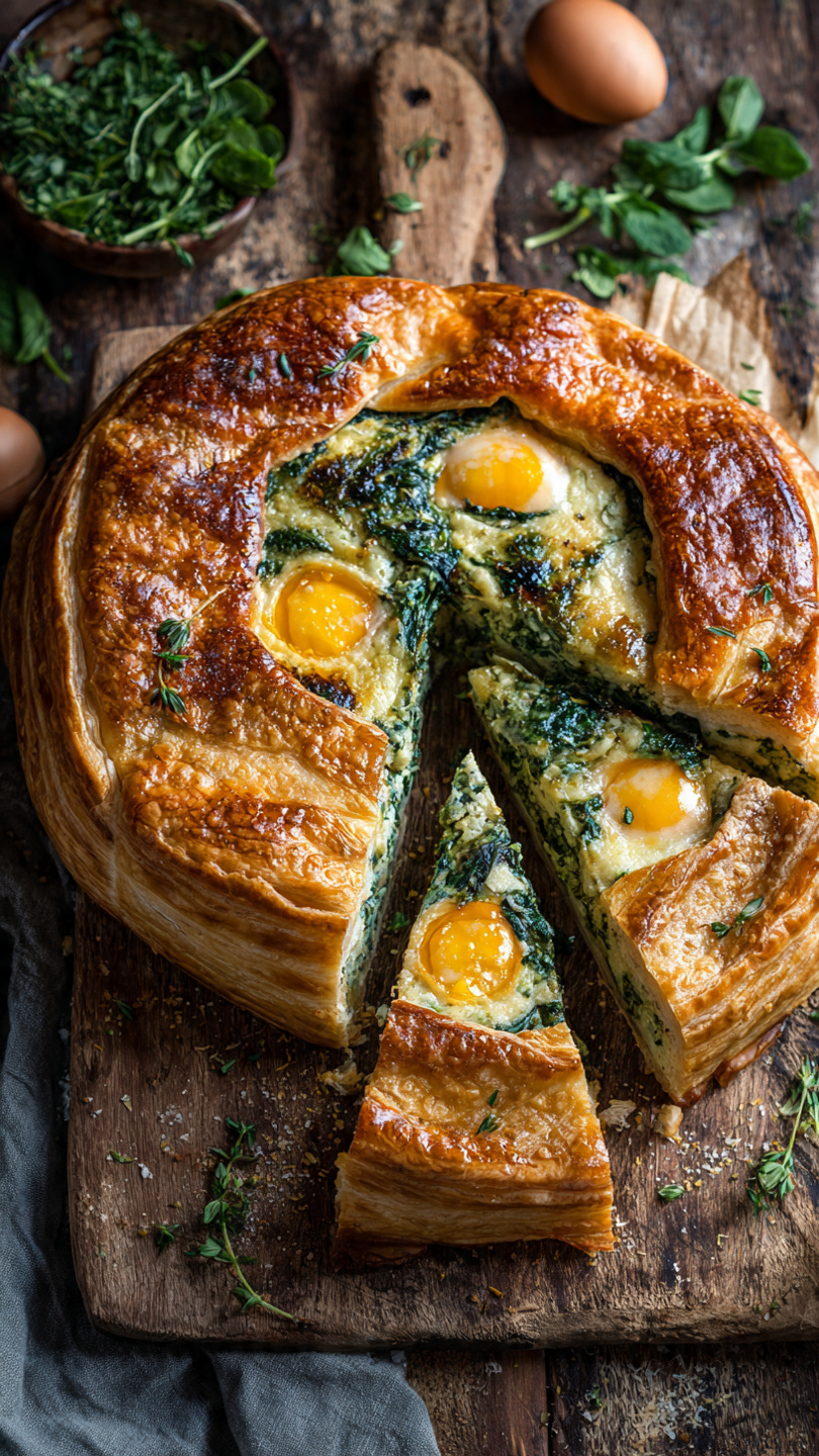 🌿🥧 Torta Pasqualina: il Rustico Ligure Tradizionale con Ricotta, Spinaci e Uova Intere